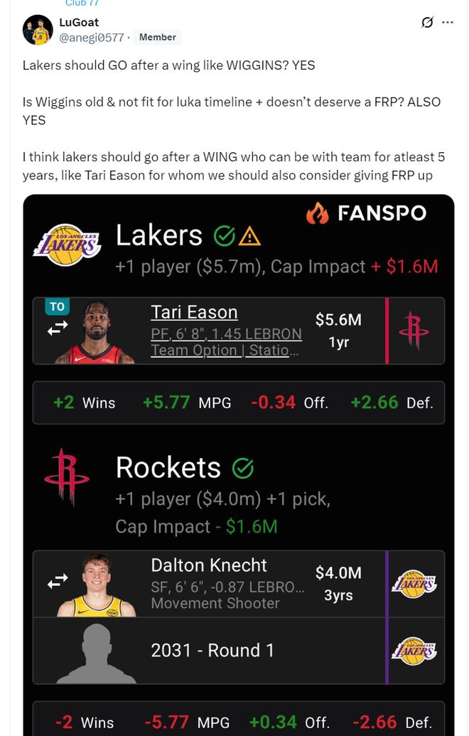 有湖人自媒体觉得如果球队可以交易得到塔里-伊森这种顶级的3D锋线,球队可以牺牲一个未来不保护的首轮签,用克内克特+2031年不保护首轮签去换伊森,这样湖人的锋线会更加充盈,明夏詹姆斯退役后伊森也可以继续辅佐东契奇。